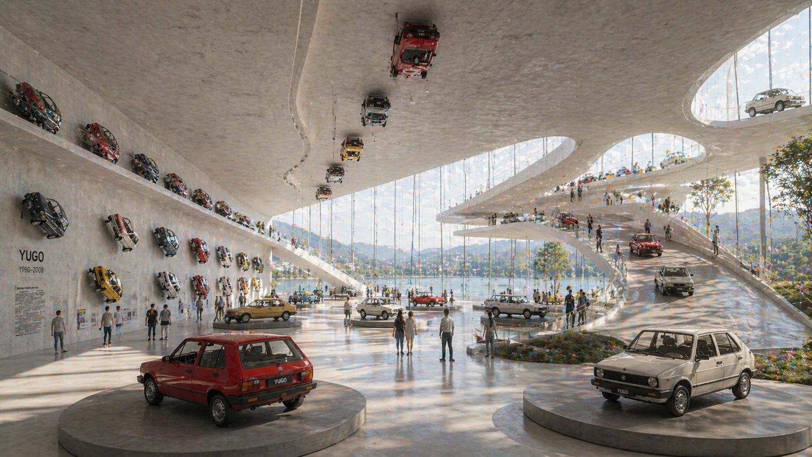 Modern futuristic building on water with curved concrete design and large glass windows.